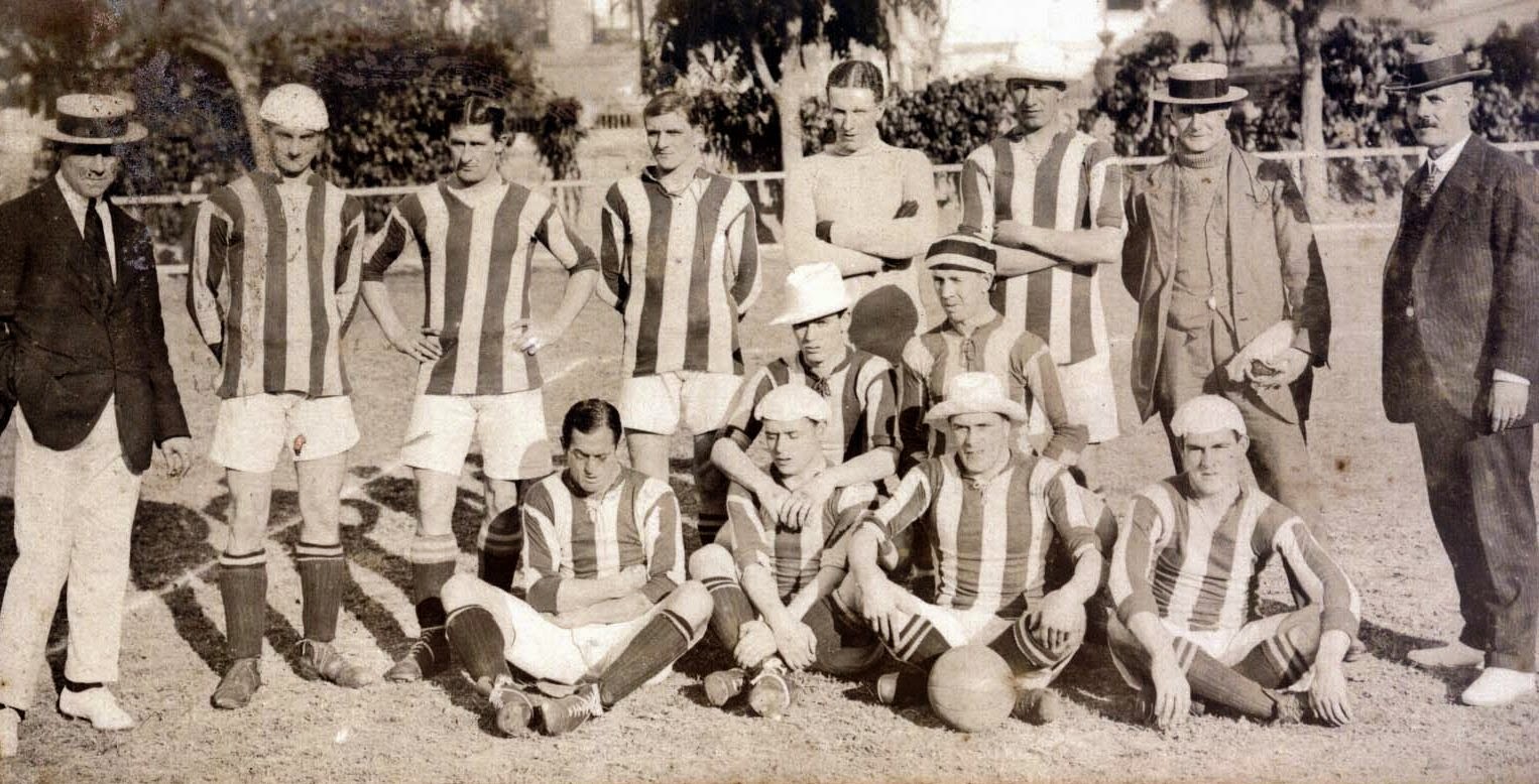 | O histórico onze brasileiro composto por: Píndaro, Marcos, e Nery (fila de cima); Sylvio Lagreca, Rubens Salles, e Rolando (fila do meio); Osvaldo Gomes, Abelardo, Friedenreich, Osman, e Formiga |