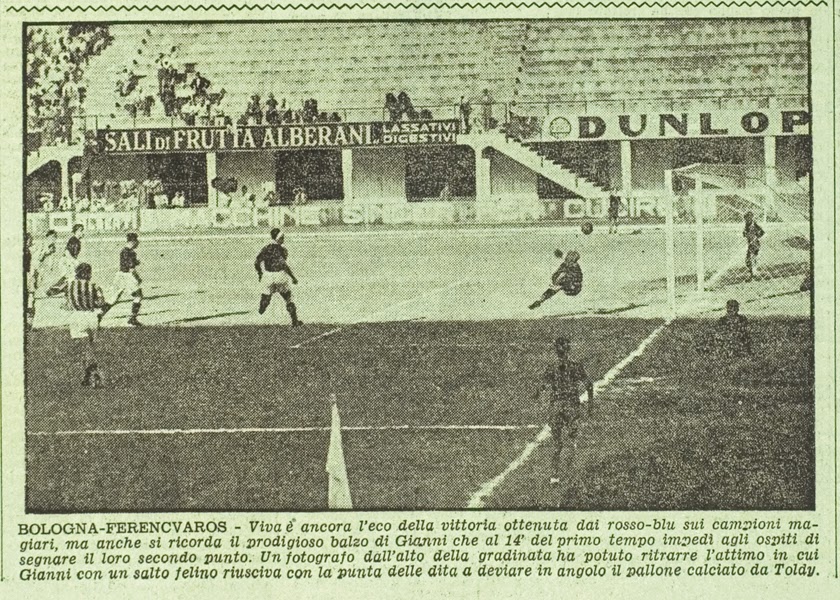 | Recorte de um jornal da época dando conta do embate entre o Bologna e o Ferencvaros |