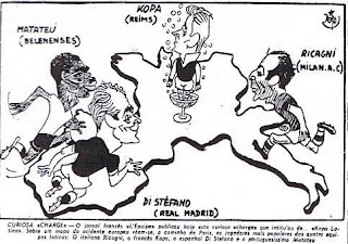 | Cartoon do jornal francês L'Équipe, com a caracterização das principais estrelas dos candidatos à conquista da Taça Latina de 1955 |